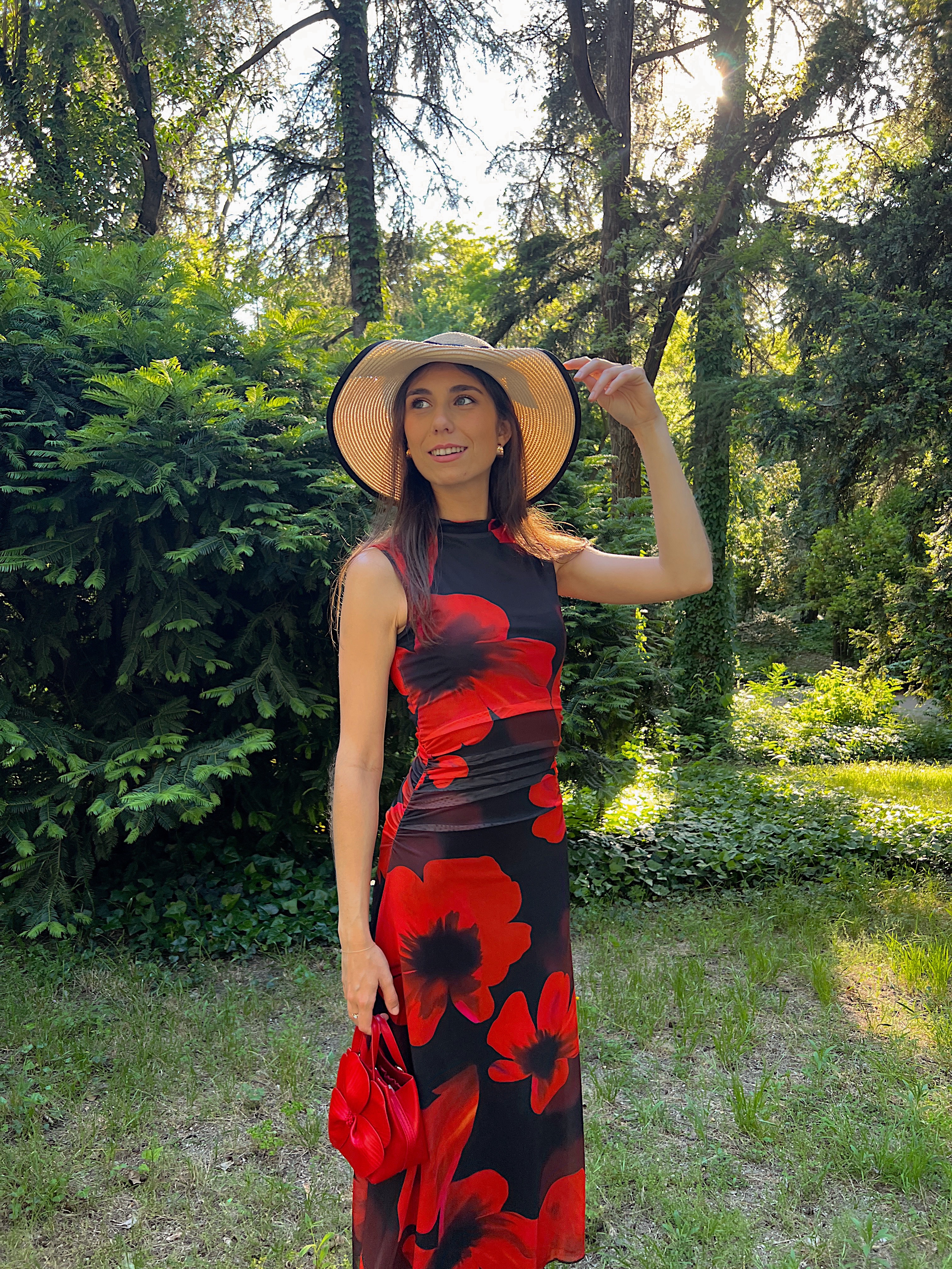 bag or clutch—like the red flower-shaped one seen in the photos—can add a